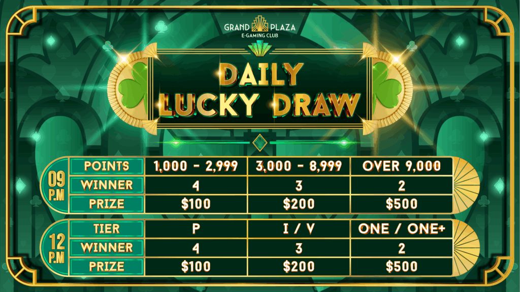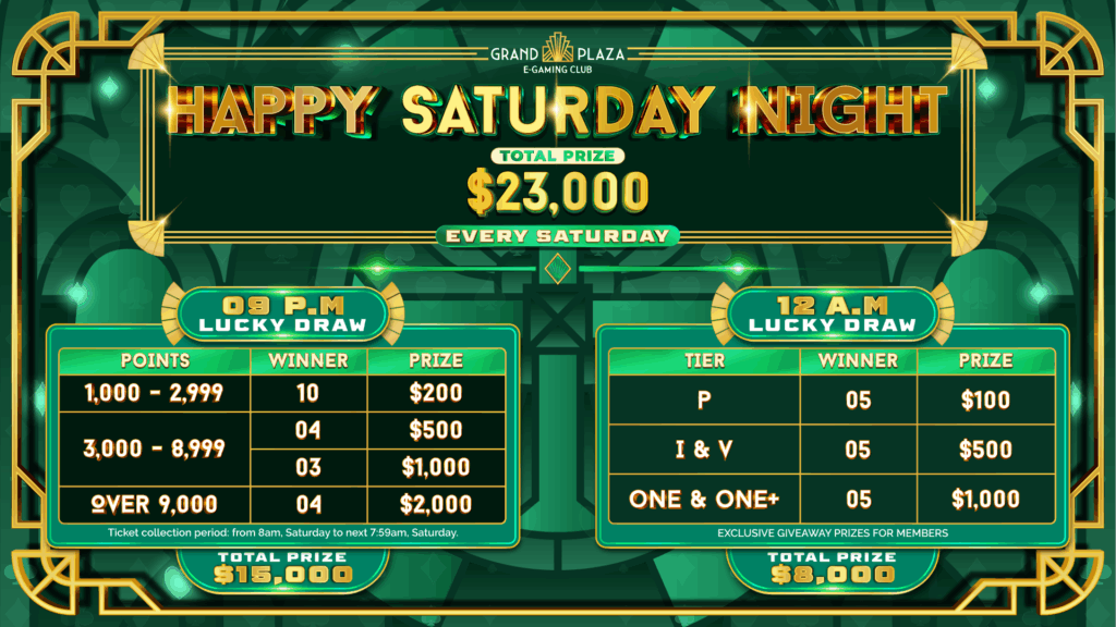 Enter our lucky draw game totalling $23,000 every Saturday night just by showing up.